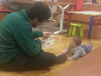 Matteo mi chiede di portare Pietro nel suo laboratorio ed entro in una stanza che non potrei definire diversamente da laboratorio, un luogo dove si lavora: più che lo studio di uno psicologo questo spazio si avvicina a una classe atipica, per alcuni versi montessoriana per la massiccia presenza di legno, materiali naturali, giochi di una volta, cassetti e scaffali etichettati, disegni di bambini alle pareti. Adagio Pietro su un materassino a terra, e Matteo inizia a dialogare con lui, lo gira su sé stesso gli pone davanti al viso oggetti, strumenti e continua questo dialogo in una lingua a me sconosciuta, composta da sillabe, canti, lallazioni. Lo chiamo dialogo perché Pietro partecipa, segue, sembra colpito e attento, e io più di lui. Matteo lavora con lui per un’ora circa, e quando il piccolo inizia a lamentarsi, capisce che ha lavorato abbastanza e che forse è stanco; mi dice che a questa età un’attività simile è come una lezione in classe e che alcuni esercizi sono paragonabili a problemi di matematica che da una parte stimolano l’attività celebrale, ma dall’altra affaticano. Stento a credere totalmente a queste parole, mi riservo di pensarci in un secondo momento perché volevo conoscere le osservazioni da lui riscontrate. Matteo mi dice che Pietro risponde agli stimoli per la sua età e che sta bene, ma mi chiede se ha avuto qualche episodio che riguardi il braccio destro: con stupore gli rispondo che durante il parto Pietro aveva il braccino sulla testa e che questo ha prolungato la fase finale del parto; lui aveva intuito la cosa e mi consiglia degli esercizi da fare con lui per portare la funzione del braccino alla sua totale capacità.